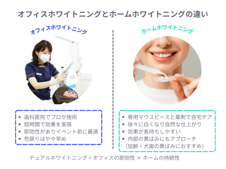 ホームホワイトニングとオフィスホワイトニングの違い|加齢や犬歯の黄ばみにおすすめの選び方