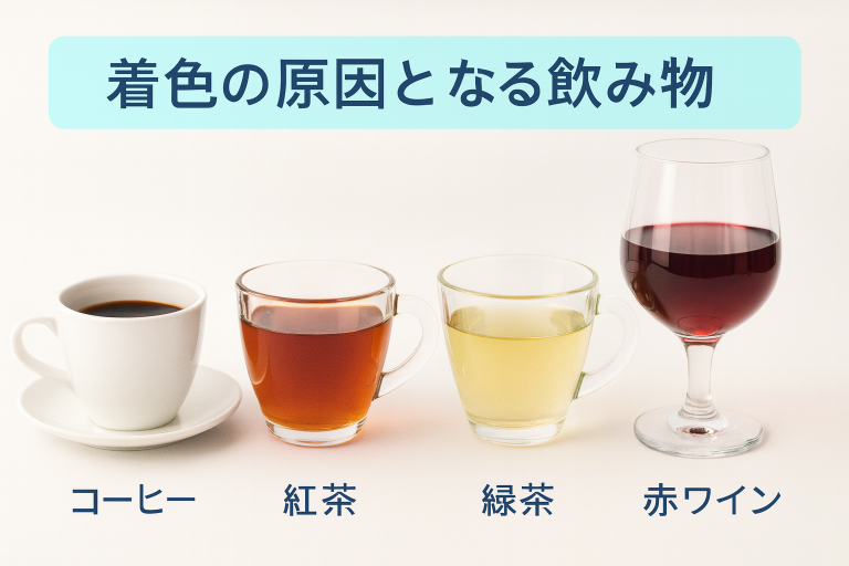 - ・食品や飲み物に含まれるポリフェノール(コーヒー、紅茶、赤ワインなど)と反応