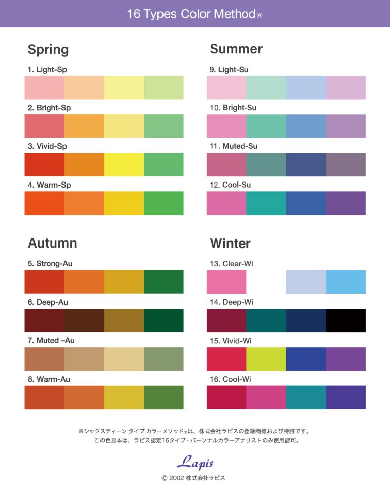 「16タイプ・パーソナルカラー」に類似した16タイプ(分類)のパーソナルカラー診断法が後発で出ていますが、16タイプカラーメソッド®は株式会社ラピスが特許権を有しており、類似のメソッドおよびツールとは別ものです。「ラピス特許 16タイプ・パーソナルカラー診断ドレープ」を使った16タイプ・パーソナルカラー診断は、「ラピスアカデミー認定16タイプ・パーソナルカラーアナリスト」にしかできません。類似の16タイプカラー診断にご注意ください。
